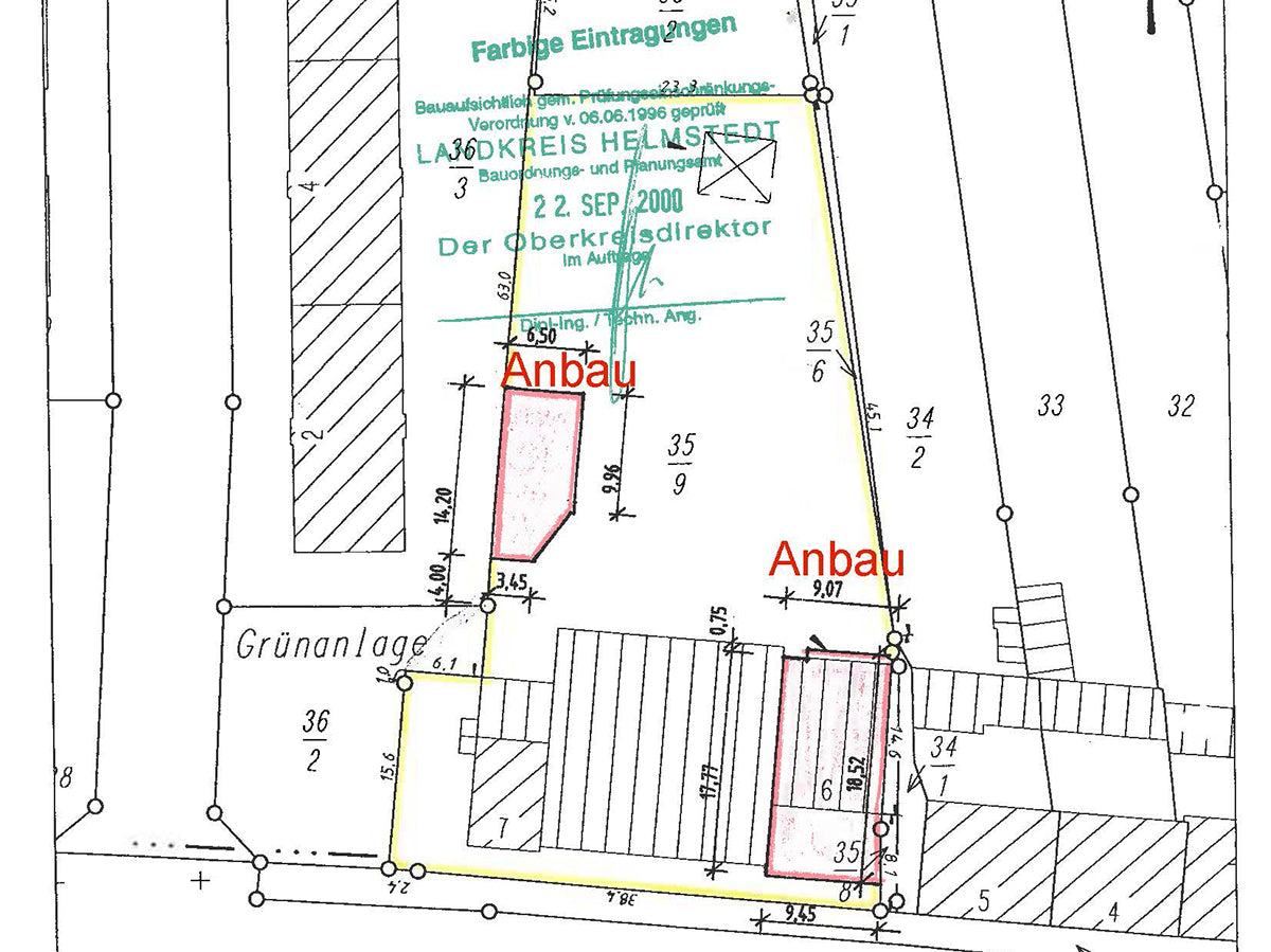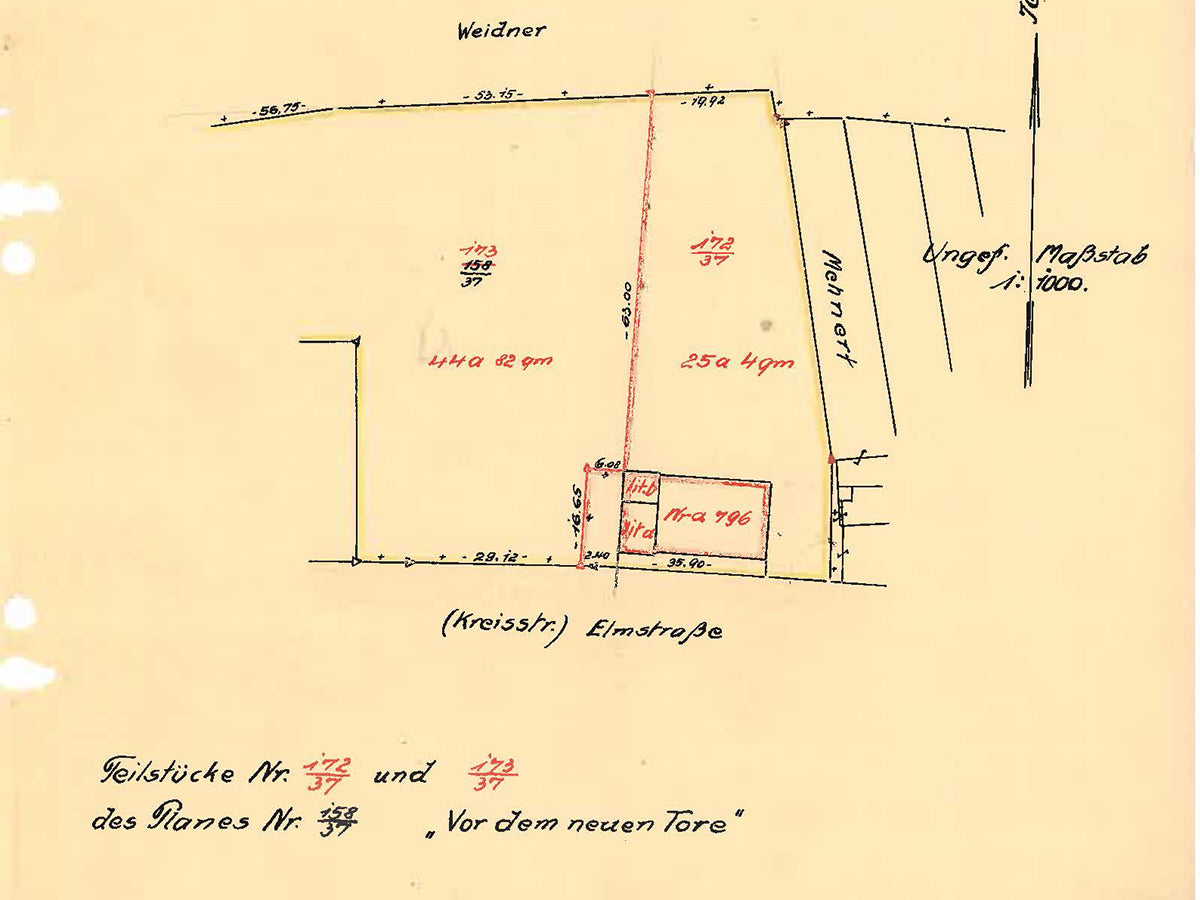 In den eingezeichneten Seitenteil des Feuerwehrgebäudes wird eine Wohnung für den Gerätewart integriert. Dafür wird an der Westseite ein separater Eingang mit Treppe geschaffen. Heute ist der Windfang wieder verschlossen und abgerissen.