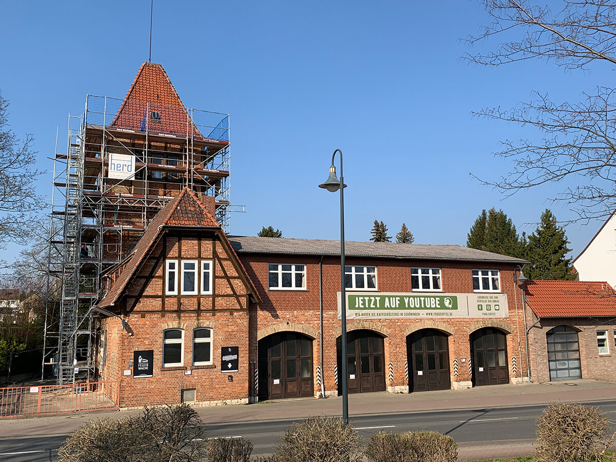 Der Antrag für die Umnutzung des Gebäudes – vom Dienstgebäude der Feuerwehr zur Kaffeerösterei – ist vorbereitet. Vor den Umbaumaßnahmen stehen aufwändige Sanierungsarbeiten an. Begonnen wird mit der Sanierung des Schlauchturms und dem Abriss des ehemaligen Hauseingangs der Einliegerwohnung. Ein mehrstöckiges Gerüst wird errichtet. Da das äußere Fachwerk an zwei Seiten des Turmes bereits nicht mehr erhalten ist, wird auch das verbleibende Fachwerk entfernt und durch durchgängiges Mauerwerk aus dänischen Wasserstrichziegeln ersetzt. Diese passen mit ihrer ungleichmäßigen Struktur und dem rotbunten Farbspiel optimal zum bestehenden Steinbild. Die alten Holzfenster werden durch helle mehrfachverglaste Fenster ersetzt. Im Mai 2020 erstrahlt der gut 20 Meter hohe Turm im neuen Glanz. Auch im Inneren des Gebäudes wird Platz für Neues geschaffen. Überflüssige Leichtbauwände und Deckenverkleidungen werden entfernt, um mehr Platz für die spätere Ausgestaltung der Räume zu schaffen.