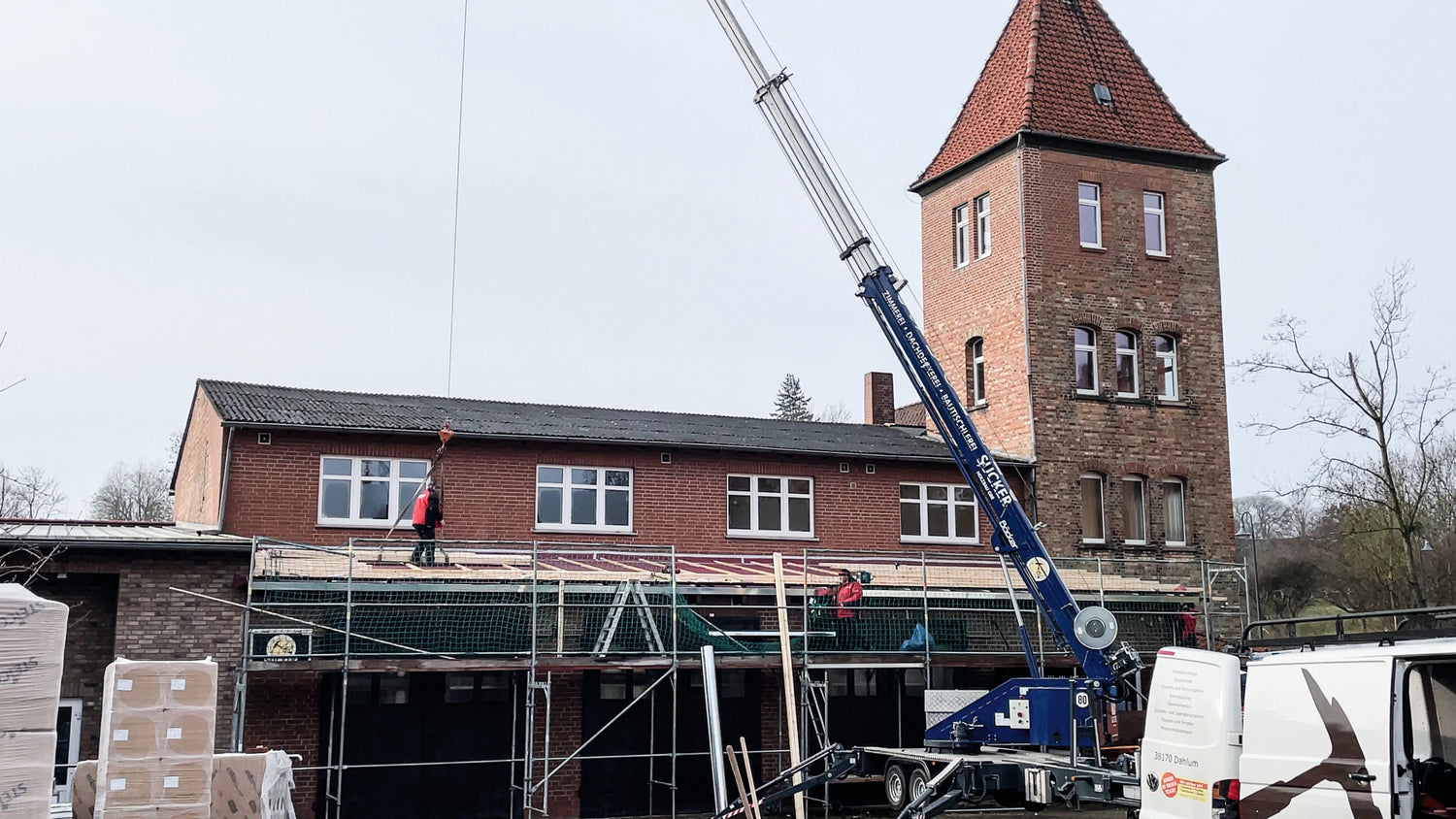 Im März 2022 stand die Erneuerung zweier Dächer an, für die wir eine Bezuschussung zur energetischen Sanierung erhalten haben. Damit die Dacharbeiten nicht den späteren Café-Betrieb stören, wurden sie schon frühzeitig ausgeführt. Nach Erhalt der Baugenehmigung im April 2022 soll es nun zügig an den Innenausbau gehen.